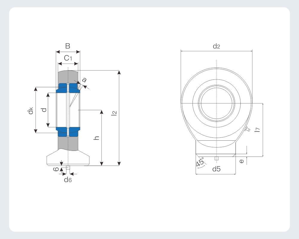 軸承的伸出桿是?焊接性能良好的材料制成的。 由向?關(guān)節(jié)軸承GE···E或GE···ES和帶有焊接坡?的伸出桿組成,桿的端部有定位銷。